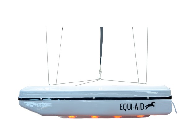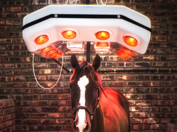 A system of multiple large red lamps emitting infra-red (ir) rays. IR is a form of heat radiation, not to be confused with ultra violet (uv) radiation which provides a source or artificial sunlight for stable kept horses.